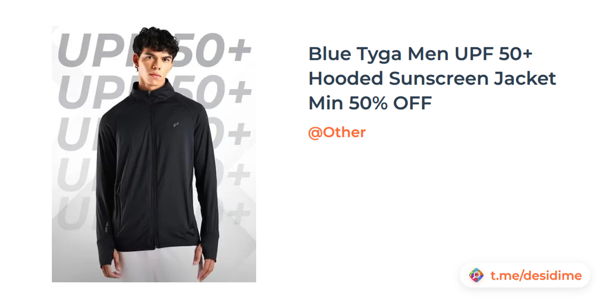 Blue Tyga Men UPF 50+ Hooded Sunscreen Jacket Min 50% OFF