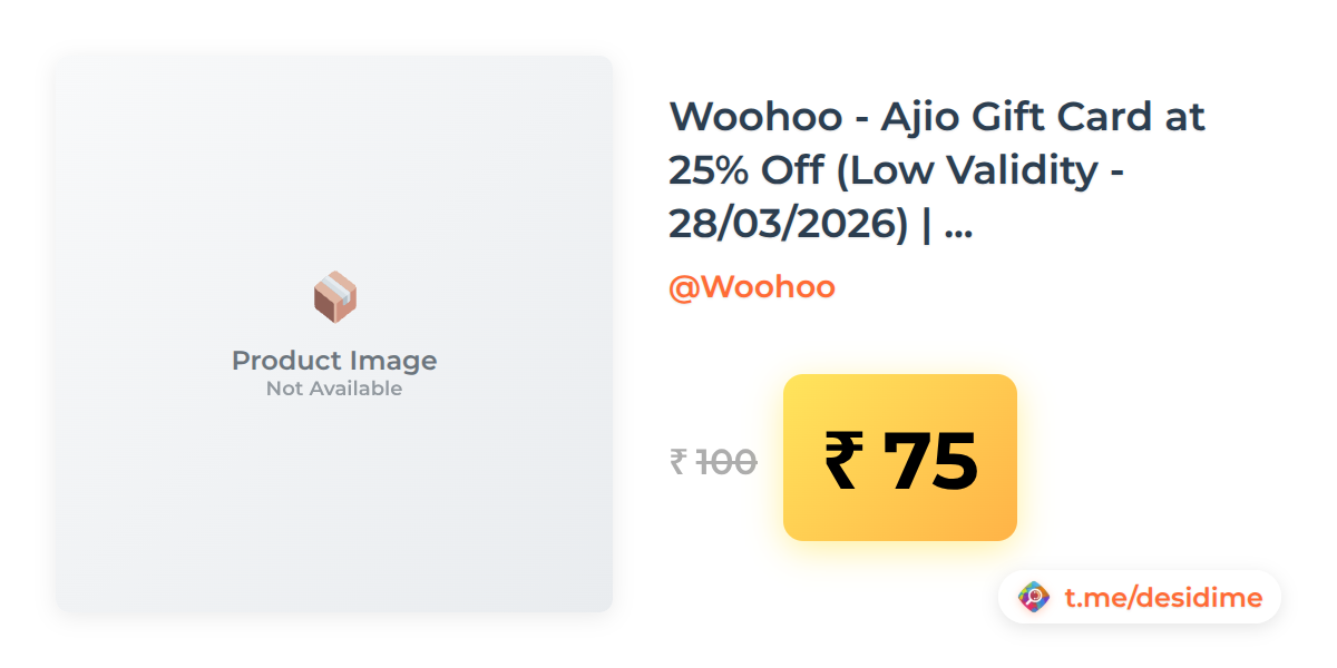 25% off on - Woohoo - Ajio Gift Card at 25% Off (Low Validity - 28/03/2026) | Denom : 100 | Max Qty : 50 - Rs. 75