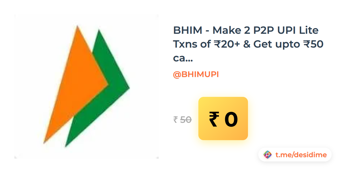 100% off on - BHIM - Make 2 P2P UPI Lite Txns of ₹20+ & Get upto ₹50 cashback 1pm-6pm (27 March 2026) - Rs. 0
