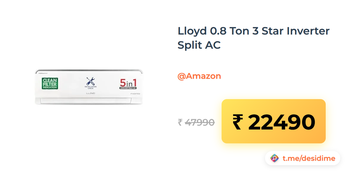 53% off on - Lloyd 0.8 Ton 3 Star Inverter Split AC - Rs. 22490