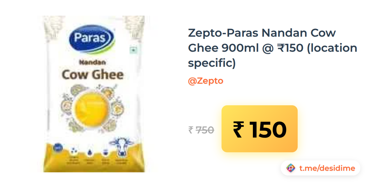 80% off on - Zepto-Paras Nandan Cow Ghee 900ml @ ₹150 (location specific) - Rs. 150