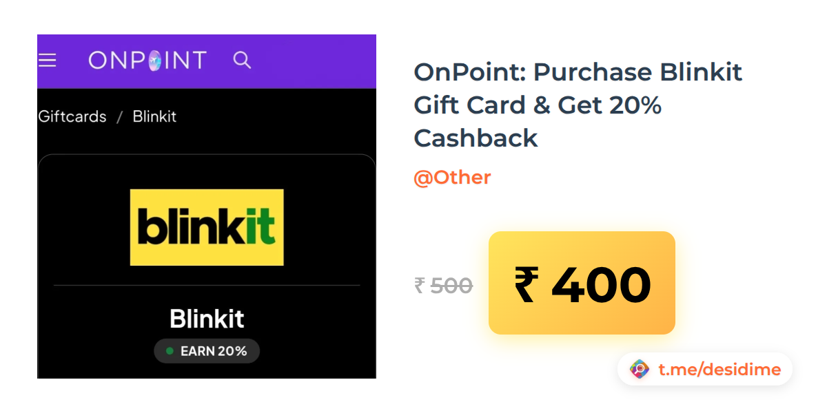 20% off on - OnPoint: Purchase Blinkit Gift Card & Get 20% Cashback - Rs. 400