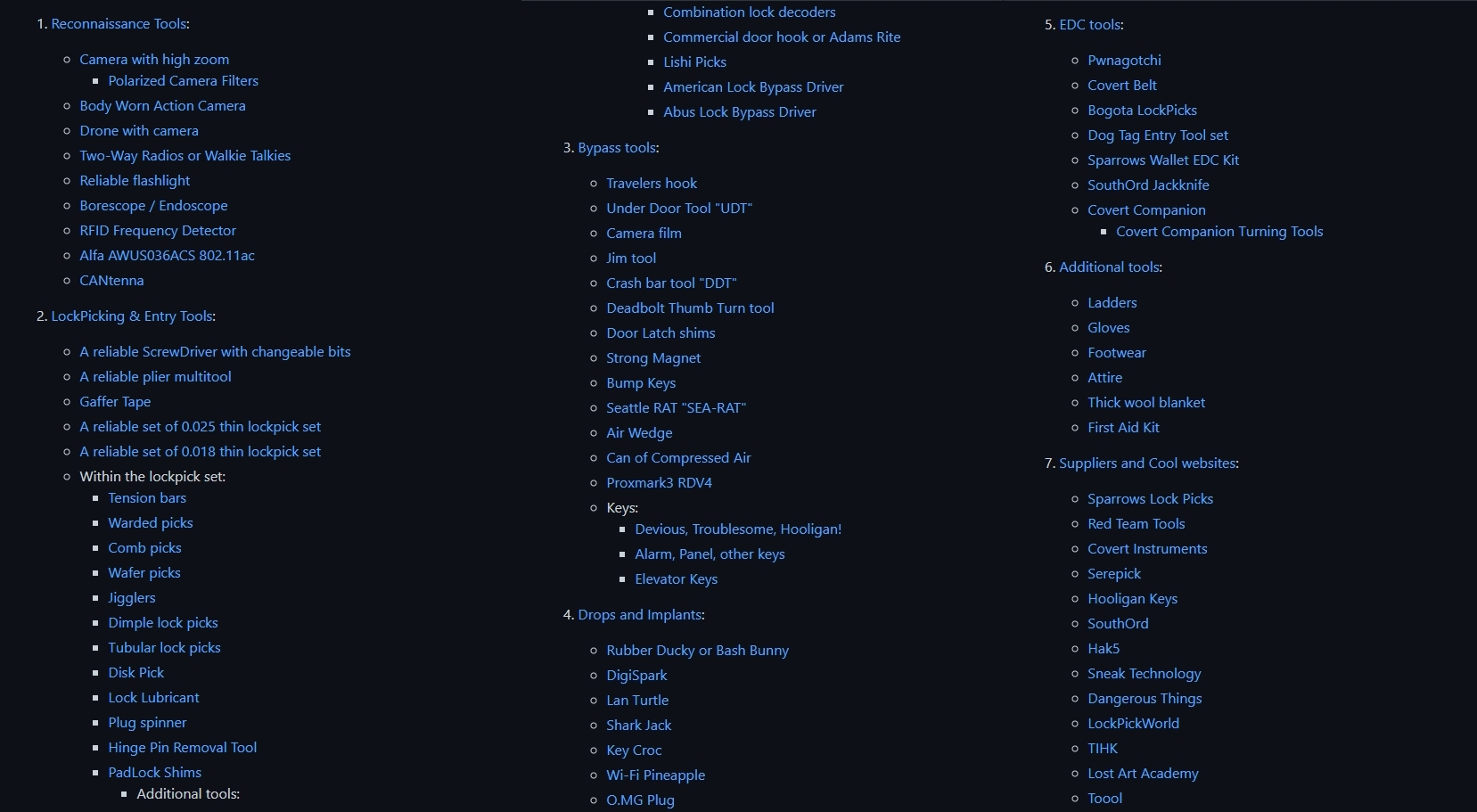 A curated list of tools that are commonly used in the field for Physical Security, Red Teaming, and Tactical Covert Entry.