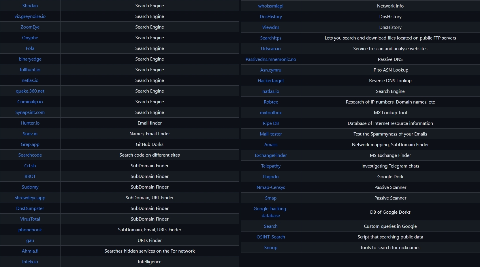 This github repository contains links/tools that a cybersec specialist can use in his work. Some of the sites included might require registration or offer more data for $$$, but you should be able to get at least a portion of the available information for no cost.