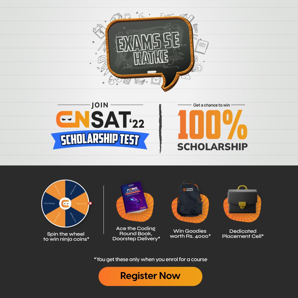 💻• Get up to 100% Scholarship on Coding Ninjas Courses. Learn C++ , Java, Python, Web Dev , Data Science and other highly sought after skills from IIT and Stanford Alumni.
