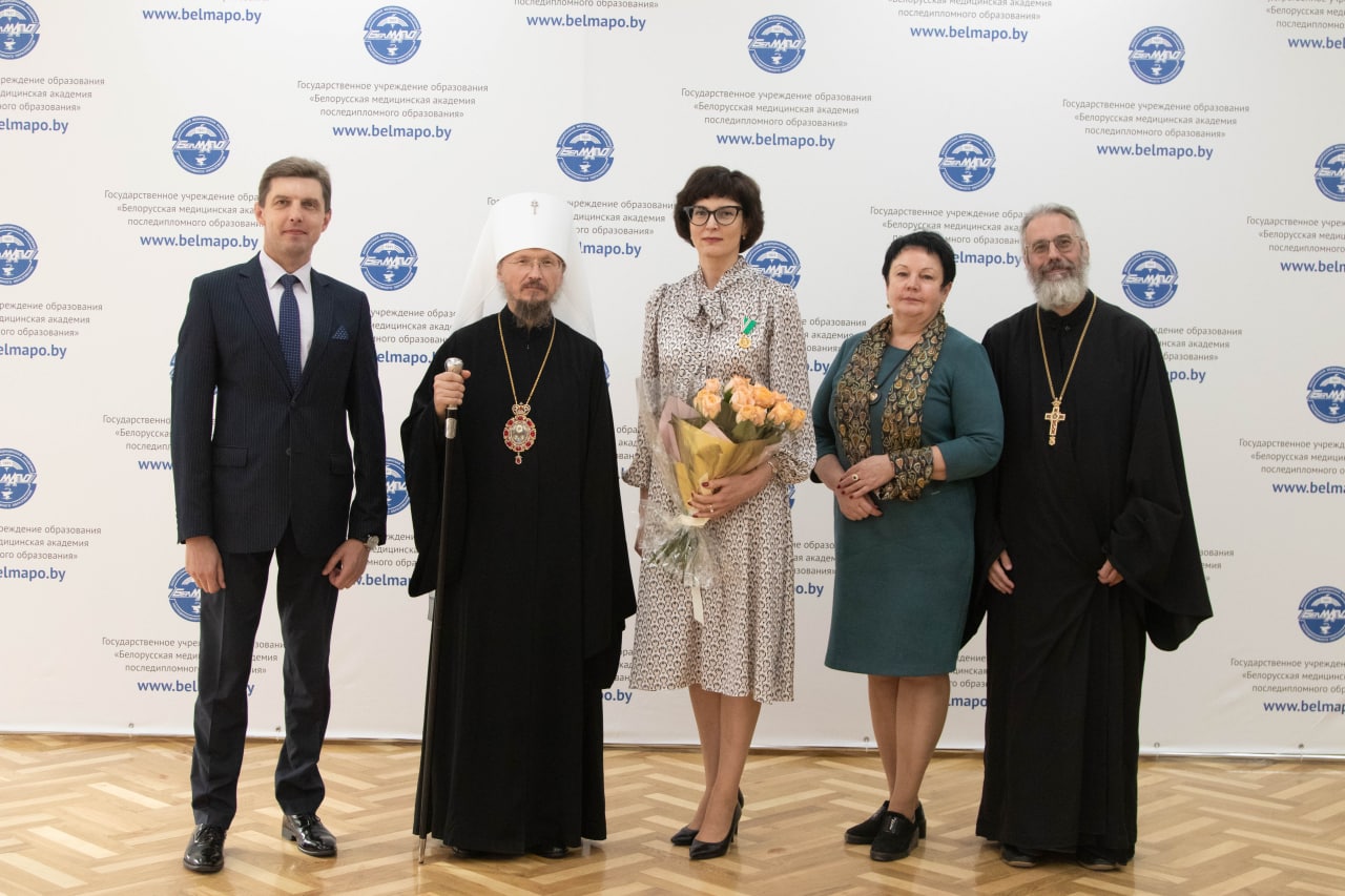 В рамках визита в БелМАПО Митрополит Минский и Заславский Вениамин, Патриарший Экзарх всея Беларуси за оказание медицинской помощи в период коронавирусной инфекции COVID-19 наградил медалью святителя Кирилла Туровского первого заместителя Министра здравоохранения Республики Беларусь Елену Кроткову.