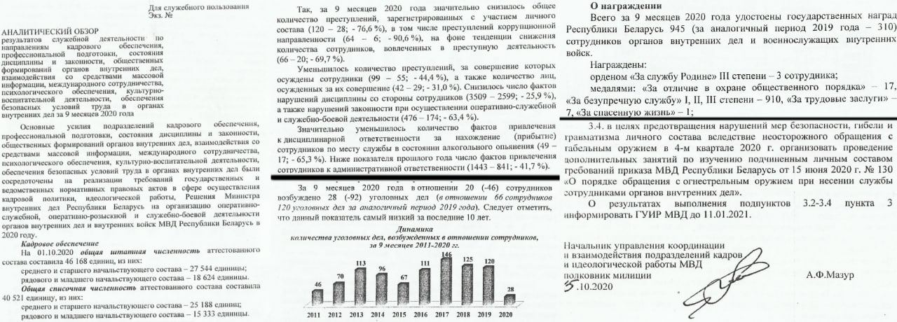 Данные показатели самые низкие за последние 10 лет, что свидетельствуют не о положительной динамике, как утверждается в документе, а о том, что в МВД с начала года был установлен негласный запрет на привлечение сотрудников к различным видам ответственности с целью сохранения кадрового ядра на фоне массовых увольнений сотрудников (в настоящее время данный запрет закреплён в распоряжении МВД Республики Беларусь от 18.08.2020 №6дсп «О стабилизации морально-психологического климата и сохранения кадрового ядра»).