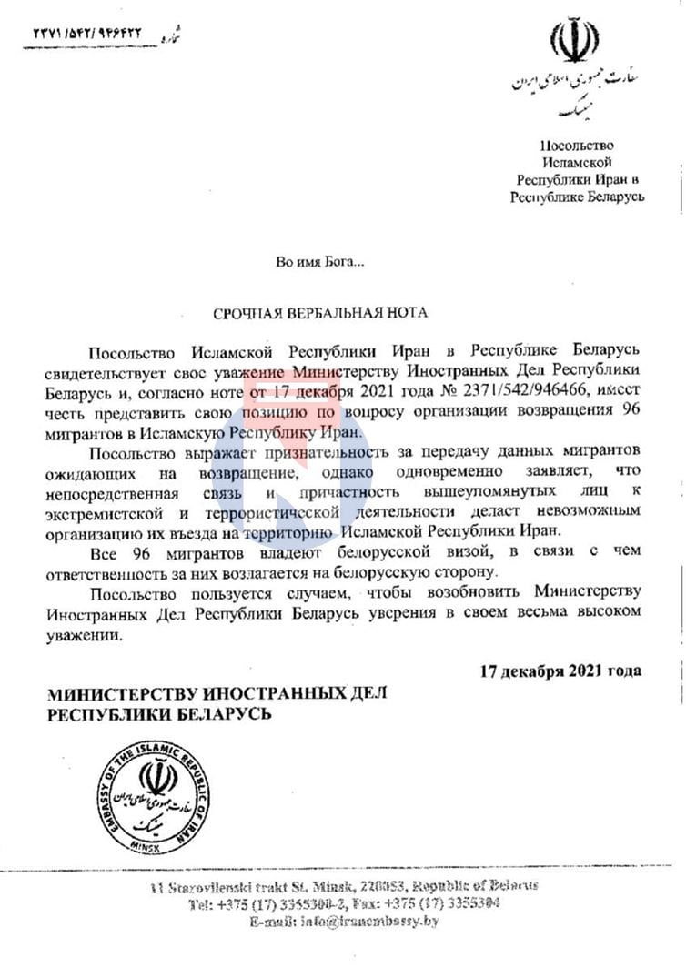 Посольство Ирана буквально послало белорусский МИД, заявив, что не может вернуть в страну 96 мигрантов, застрявших в Беларуси, поскольку эти люди причастны к экстремистским или террористическим группировкам.