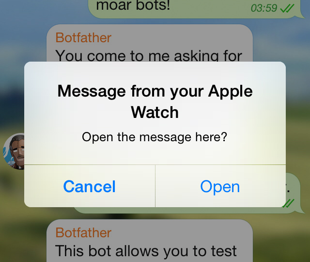 Chats on your Apple Watch will show all the content available on Telegram: photos, stickers, locations, documents and videos. For those cases when the watch can‘t handle something, we’ve added a shortcut to easily open any message on your Phone.