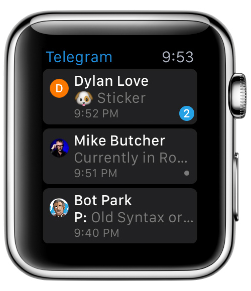 Finally! Telegram 3.0 arrived with full Apple Watch support. You can view your recent chats and reply to messages with stickers, locations, emoji, preset phrases or dictated text. You can also view user and group profiles, start new chats, and even block users.