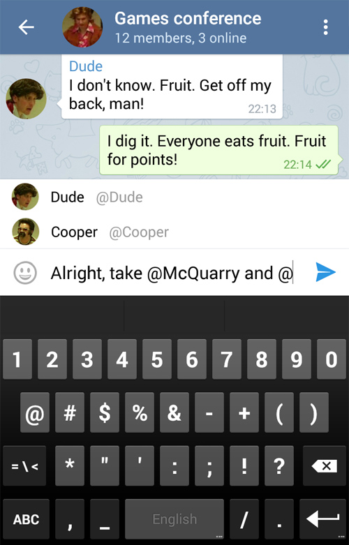 If you want several people within a group chat to get instantly involved in the conversation, you may now also mention them in a message, provided they have a username:
