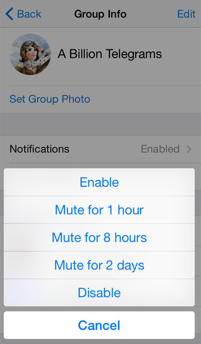 You can now temporarily mute notifications from particular contacts and groups for 1 hour, 8 hours or 2 days. On Android, open the ‘…’ menu in a chat and choose ‘Mute notifications’. On iOS, go to group or contact info and tap on Notifications. iOS8 users can now also use interactive notifications to mute a contact or group for 8 hours.